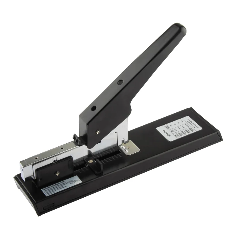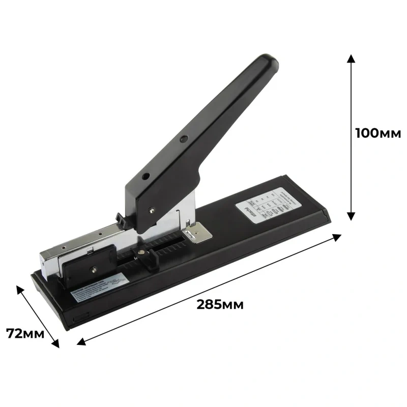 Мощный степлер с максимальной толщиной сшивания бумаги до 100 листов. Глубина закладки листов регулируется от 7 до 70 мм. Пластиковая основа степлера не царапает поверхность стола и предотвращает скольжение. Загрузка скоб в степлер осуществляется фронтально. Тип и размер используемых скоб: N23/6, 23/8, 23/10, 23/13 Вместимость скоб: 100 штук. Инструкция по удалению застрявших скоб:1. Извлеките оставшиеся скобы из контейнера. 2. Установите карандаш между ручкой степлера и основанием за местом выхода скоб. 3. Надавите на рычаг степлера для удаления застрявшей скобы. Для эффективного сшивания максимально допустимого объёма бумаги необходимо расположить степлер на горизонтальной твёрдой поверхности, прикладывая усилия, плавно надавить на рычаг (при необходимости двумя руками), разномерно распределяя усилия по поверхности рычага.