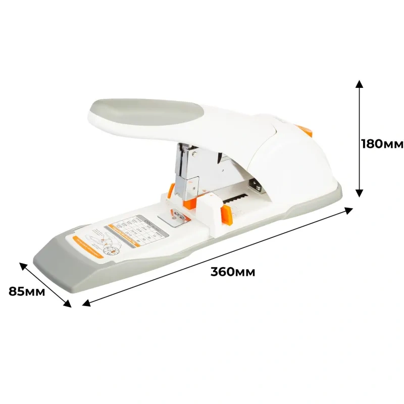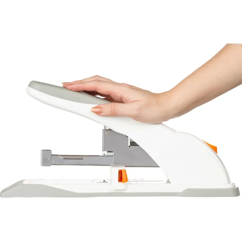 Для эффективного сшивания максимально допустимого объема бумаги необходимо расположить степлер на горизонтальной твердой поверхности, прикладывая усилия, плавно надавить на рычаг (при необходимости двумя руками), разномерно распределяя усилия по поверхности рычага.