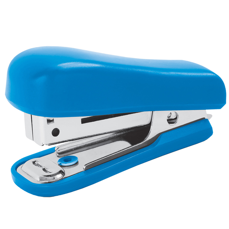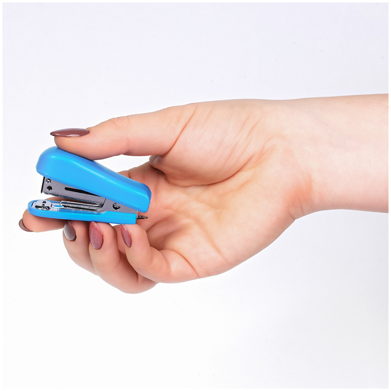 Компактный мини-степлер сшивает до 10 листов, вмещает 50 скоб №10, есть встроенный антистеплер. Пластиковый корпус, металлический механизм, цвет корпуса - синий.