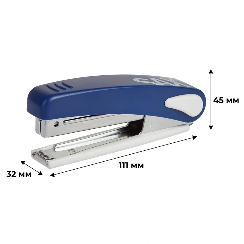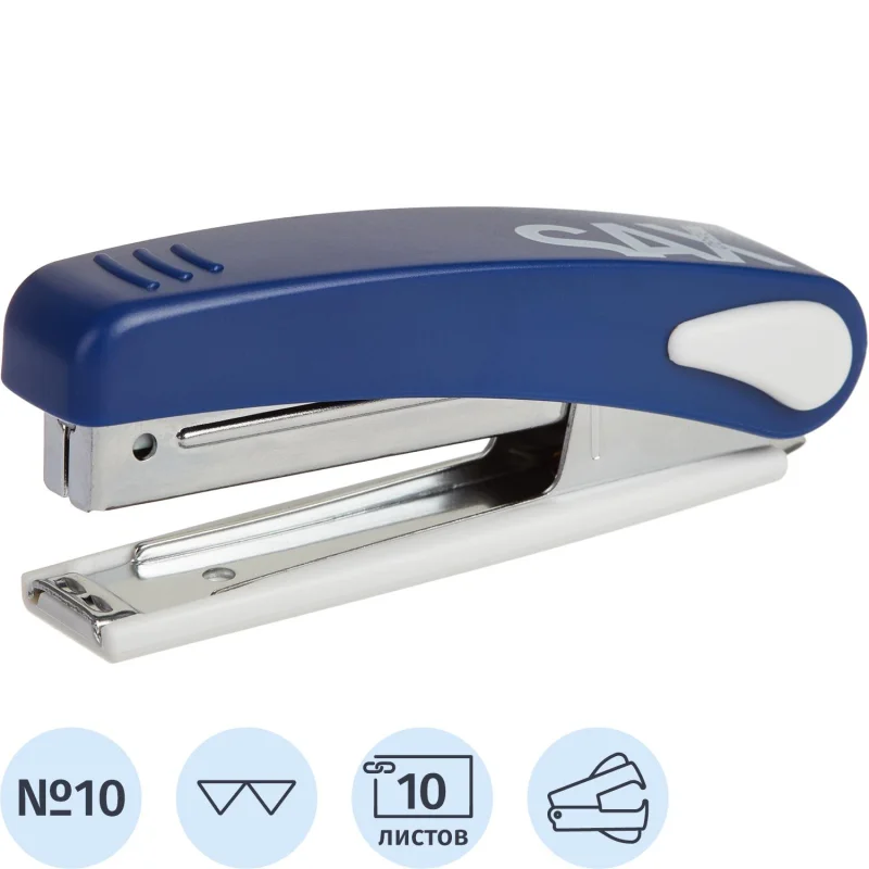 Степлер Sax 219 одновременно сшивает до 10 листов плотностью 80 г/кв.м. Удобный и эргономичный. Позволяет производить сшивание закрытым способом. Степлер незаменим при работе в офисе или дома с документами. Модель оснащена встроенным антистеплером. Глубина закладки бумаги — 56 мм (5.6 см). Корпус выполнен из металла и пластика, цвет синий. В степлере используются скобы № 10. Размер изделия: ДхШхВ 111×45×32 мм. Вместимость скоб — 100 штук. Степлер является очень компактным и удобным, не занимая много места на рабочем столе.