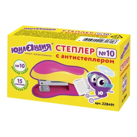 Для скрепления до 15 листов. Размер скоб №10. Глубина закладки бумаги - 25 мм. Закрытый вид сшивания. Эргономичная форма корпуса обеспечивает продолжительное время использования без перерыва. Данная модель может выступать в качестве антистеплера, позволяющего разжать закрепленные скобы более качественно, не нанося повреждений ни материалу, ни кончикам пальцев. За счет компактных размеров не займет на парте или столе много места, а сочетание желтого с розовым цветом добавят яркости во время уроков или написания домашней работы.