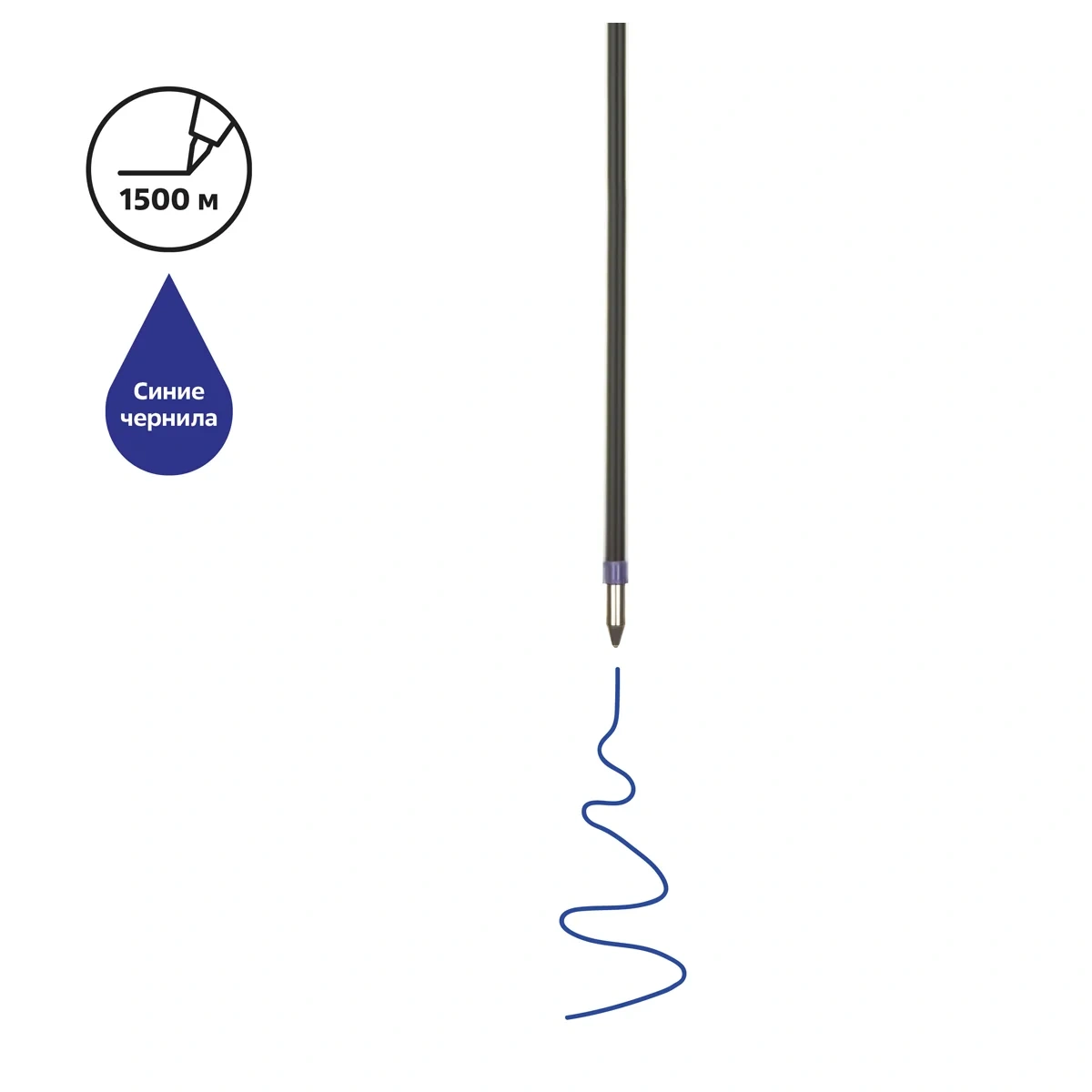 Синие чернила пониженной вязкости на масляной основе обеспечивают мягкое и плавное письмо, не текут и не мажутся. Износостойкий наконечник и большой запас чернил позволяют долго использовать ручку для ведения записей. Длина линии письма в два раза больше стандартной – 1 500 м. В картонной упаковке – сто стержней.
