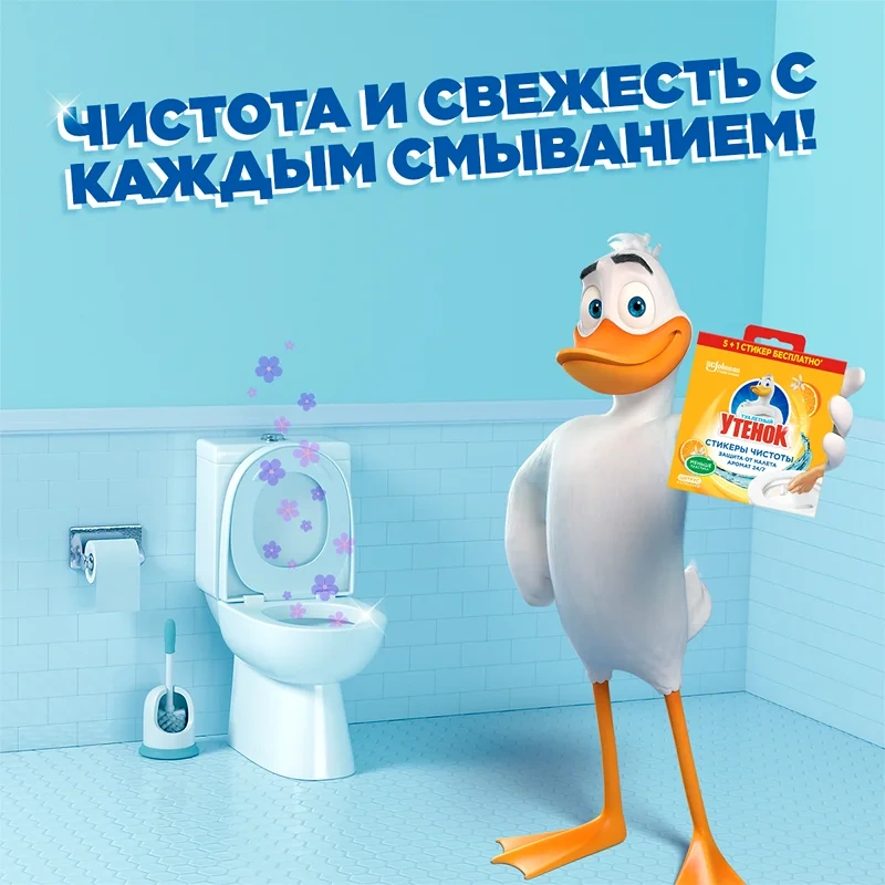Туалетный Утенок Стикеры Чистоты Цитрус теперь в большой выгодной упаковке! Стикеры поддерживают чистоту и свежесть в туалете до 10 недель. Защищают от известкового налета, борются с очагами скопления микробов. Благодаря Стикерам Чистоты на поверхности унитаза образуется защитный слой, который препятствует формированию минеральных отложений, являющихся очагами скопления микробов. Стикер легко крепится к внутренней поверхности унитаза, оставляет приятный свежий аромат после смывания. В отличие от других подвесных блоков для унитаза Стикеры более экологичны, так как не содержат пластикового корпуса. А еще они более гигиеничны, ведь не нужно прикасаться к грязным подвесным блокам! Совет по использованию: важно приклеивать Стикер только на сухую поверхность. В упаковке 6 Стикеров. 1 Стикер идет в подарок.