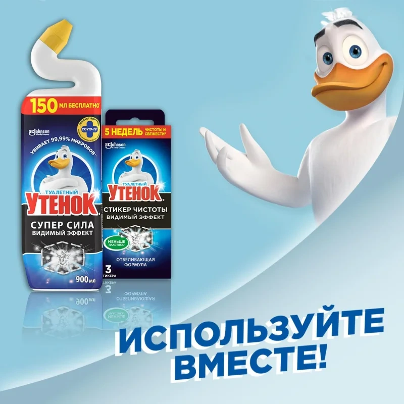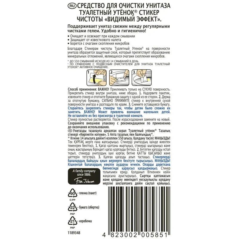 Стикер для унитаза Туалетный утенок Океанский оазис (3 штуки в упаковке) Чистит и освежает. Удобно и гигиенично. Содержит отбеливающий компонент (активный хлор), который эффективно очищает и отбеливает поверхность унитаза, а также обладает антимикробным действием. Благодаря очистителю Туалетный утенок «Стикер чистоты» на поверхности унитаза образуется защитный слой, который препятствует образованию минеральных отложений, являющихся очагами скопления микробов. Очиститель крепится внутри унитаза ниже ободка на сухую поверхность. Обладает приятным ароматом, полностью растворяется в воде. Упаковки стикеров хватает более, чем на 550 смываний. Способ применения. Надорвите пакетик, извлеките стикер и отогните бумажную защиту с одной из ее сторон. Держа за отогнутую бумажку, СИЛЬНО ПРИЖМИТЕ стикер к внутренней сухой поверхности унитаза и разгладьте по краям. Снимите оставшуюся бумагу. Старайтесь закреплять стикеры так, чтобы их сложно было заметить. Стикер полностью растворяется. После израсходования замените на новый. Сохраняйте внешнюю упаковку с рекомендациями по применению до окончания использования. Меры предосторожности. При попадании в глаза вызывает выраженное раздражение. При попадании на кожу вызывает слабое раздражение. Вредно для водных организмов с долгосрочными последствиями. Использовать только по назначению согласно инструкции. Беречь от детей и домашних животных. При необходимости обратиться за медицинской помощью, по возможности показать упаковку/маркировку продукта. После обращения со средством тщательно вымыть руки. Использовать перчатки, средства защиты глаз. ПРИ ПОПАДАНИИ В ГЛАЗА: осторожно промыть глаза водой в течение нескольких минут. Снять контактные линзы, если Вы ими пользуетесь и, если это легко сделать. Продолжить промывание глаз. Если раздражение глаз не проходит, обратиться за медицинской помощью. ПРИ ПРОГЛАТЫВАНИИ: при плохом самочувствии обратиться за медицинской помощью. Избегать попадание в окружающую среду. Состав. а-ПАВ ≥ 30%, сульфат натрия, отдушка (Бутилфенилметилпропиональ, кумарин, цитраль), н-ПАВ <5%, дихлоризоцианурат натрия <5%, акриловый сополимер <5%. Условия хранения. Хранить при температуре от −5 до +30 градусов в сухом, недоступном для детей и домашних животных месте, отдельно от пищевых продуктов, напитков и корма для животных. После использования или по окончании срока годности упаковку/содержимое утилизировать как бытовые отходы.Срок годности. 24 месяца.