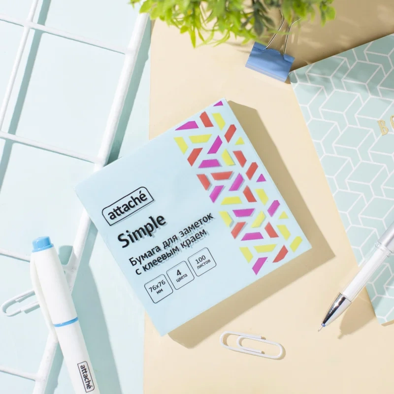 Стикеры Attache Simple Акварельная радуга выполнены в формате 76x76 мм и представлены в 4 цветах. Тон стикеров - неоновый. Плотность бумаги составляет 62 г/кв.м, клейкий слой - 16 Н/м. В упаковке находится 100 листов, размещенных в блистере. Длина клейкой стороны - 76 мм. После удаления бумаги с поверхности не остаются следы клеевого состава, лист можно крепить повторно. Особых условий хранения не требуется, сертификация не обязательна, срок годности не ограничен.