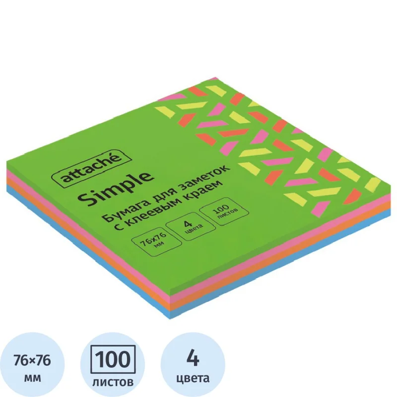 Стикеры ATTACHE Bright colours 76х76 Весен.радуга 100л Стикеры Attache Simple Весенняя радуга в формате 76x76 мм, 4 цвета. Идеально подойдут для сотрудников творческих профессий и руководителей: рекомендуются для использования в процессе совещаний, обучения, мозговых штурмов. Тон стикеров - неоновый. Плотность бумаги составляет 62 г/кв.м, клейкий слой - 16 Н/м. В упаковке 100 листов, в блистере. Длина клейкой стороны 76 мм. После удаления бумаги на поверхности не остается следов клеевого состава, лист можно крепить повторно. Особых условий хранения не требует, сертификации не подлежит, срок годности не ограничен. Чтобы увеличить срок службы стикеров, пожалуйста, следуйте рекомендациям: 1) Отделять стикер от блока следует вдоль клеевой полосы. Так можно избежать скручивания и последующего отклеивания стикера. 2) Прежде чем наклеивать стикер, убедитесь в отсутствии грязи и пыли на поверхности. На чистой поверхности срок службы клеевого слоя более продолжителен. Товар относится к ценовому сегменту 'суперэконом'. Имеет упрощенные характеристики и более простую упаковку. Отвечает основным требованиям потребления. Законодательные и технические документы: