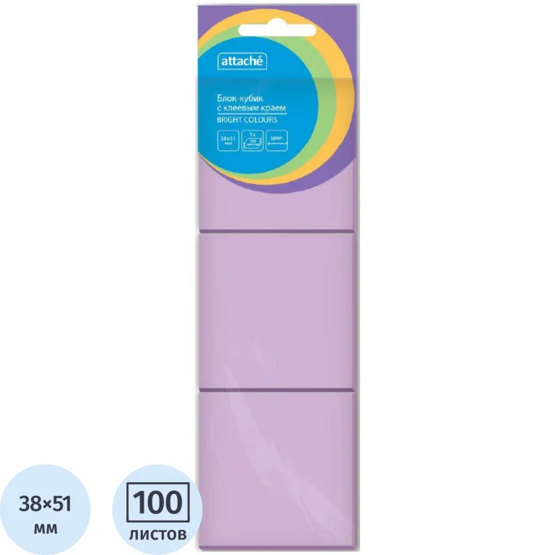 Стикеры ATTACHE Bright colours с клеев.краем 38х51 фиолетовый 100л 3 шт/наб Стикеры Attache в формате 38x51 мм, фиолетового цвета по 100 листов в каждом блоке (всего 300 листов). Хорошо подойдут для сотрудников творческих профессий и руководителей: рекомендуются для использования в процессе совещаний, обучения, мозговых штурмов. Тон стикеров - пастельный. Плотность бумаги составляет 60 г/кв.м, клейкий слой - 16 Н/м. В наборе 3 блока по 100 листов, в блистере. Длина клейкой стороны 38 мм. После удаления бумаги на поверхности не остается следов клеевого состава, лист можно крепить повторно. Особых условий хранения не требует, сертификации не подлежит, срок годности не ограничен. Чтобы увеличить срок службы стикеров, пожалуйста, следуйте рекомендациям: 1) Отделять стикер от блока следует вдоль клеевой полосы. Так можно избежать скручивания и последующего отклеивания стикера. 2) Прежде чем наклеивать стикер, убедитесь в отсутствии грязи и пыли на поверхности. На чистой поверхности срок службы клеевого слоя более продолжителен. Товар относится к ценовому сегменту 'суперэконом'. Имеет упрощенные характеристики и более простую упаковку. Отвечает основным требованиям потребления. Законодательные и технические документы: