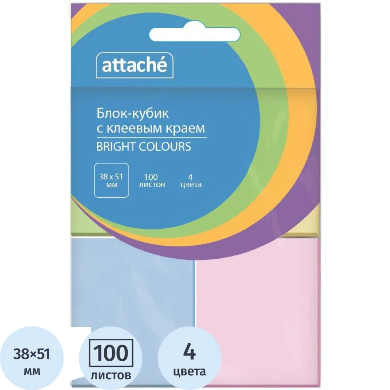 Стикеры ATTACHE Bright colours с клеев. краем 38x51 компле кт 4 цвета 100л Стикеры Attache в формате 38x51 мм состоят из 4 блоков по 100 листов каждый. Хорошо подойдут для сотрудников творческих профессий и руководителей: рекомендуется для использования в процессе совещаний, обучения, мозговых штурмов. Комплект из 4 пастельных цветов (желтый, салатовый, голубой, светло-розовый), в блистере. Плотность бумаги составляет 60 г/кв.м, клейкий слой - 16 Н/м. После удаления бумаги на поверхности не остается следов клеевого состава, лист можно крепить повторно. Длина клейкой стороны 38 мм. Особых условий хранения не требует, сертификации не подлежит, срок годности не ограничен. Чтобы увеличить срок службы стикеров, пожалуйста, следуйте рекомендациям: 1) Отделять стикер от блока следует вдоль клеевой полосы. Так можно избежать скручивания и последующего отклеивания стикера. 2) Прежде чем наклеивать стикер, убедитесь в отсутствии грязи и пыли на поверхности. На чистой поверхности срок службы клеевого слоя более продолжителен. Товар относится к ценовому сегменту 'суперэконом'. Имеет упрощенные характеристики и более простую упаковку. Отвечает основным требованиям потребления. Законодательные и технические документы: