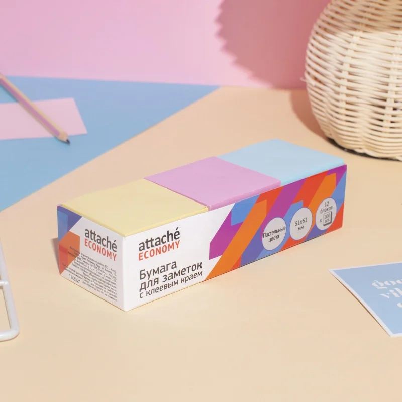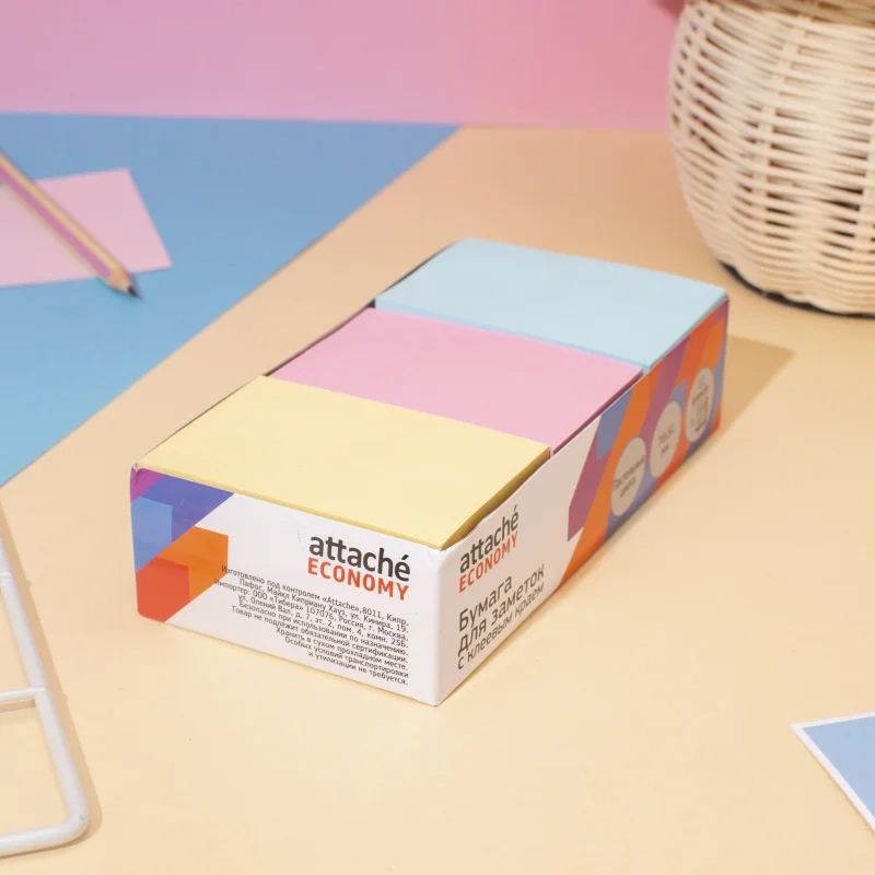 Стикеры Attache Economy 51x51 мм, 100 л, цв в асс, 12 бл/уп '1408010 Стикеры Attache Economy подходят для использования в офисе, дома, во время обучения. Формат: 51x51 мм. Клеевая система - 18 Н/м. Длина клейкой стороны 51 мм. 12 блоков по 100 листов, упакованых в коробку и термопленку. 3 пастельных цвета. Особых условий хранения не требует, сертификации не подлежит, срок годности не ограничен. Чтобы увеличить срок службы стикеров, пожалуйста, следуйте рекомендациям: 1) Отделять стикер от блока следует вдоль клеевой полосы. Так можно избежать скручивания и последующего отклеивания стикера. 2) Прежде чем наклеивать стикер, убедитесь в отсутствии грязи и пыли на поверхности. На чистой поверхности срок службы клеевого слоя более продолжителен. Товар относится к ценовому сегменту 'суперэконом'. Имеет упрощенные характеристики и более простую упаковку. Отвечает основным требованиям потребления.