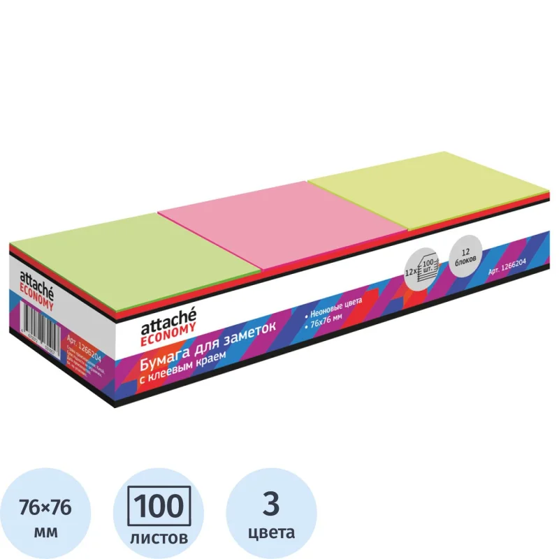 Стикеры Attache в формате 76×76 мм, в упаковке 12 блоков по 100 листов (всего 1200 листов). Идеально подойдут для сотрудников творческих профессий и руководителей: рекомендуется для использования в процессе совещаний, обучения, мозговых штурмов. Плотность бумаги составляет 75 г/кв.м, клейкий слой — 16 Н/м . Длина клейкой стороны 76 мм. В упаковку входят стикеры 3 неоновых цветов: розового, желтого, зеленого. Особых условий хранения не требует, сертификации не подлежит, срок годности не ограничен.