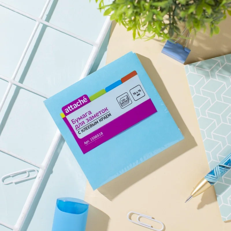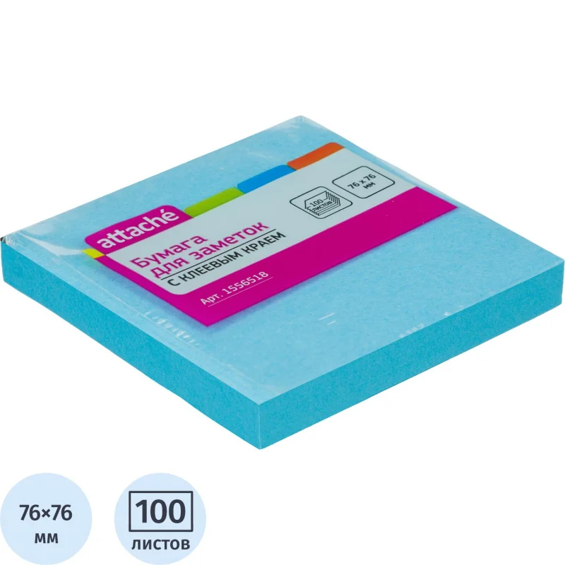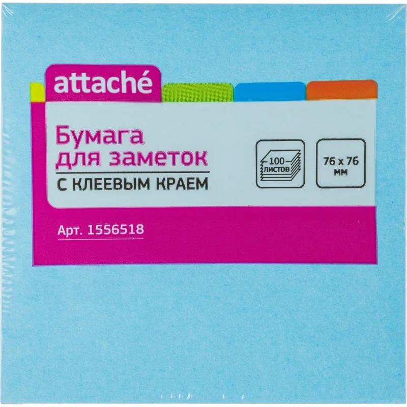 Стикеры Attache с клеев. краем 76х76, неон, голубой 100л Стикеры Attache в формате 76x76 мм, голубого цвета, 100 листов. Хорошо подойдут для сотрудников творческих профессий и руководителей: рекомендуются для использования в процессе совещаний, обучения, мозговых штурмов. Тон стикеров - неоновый. Плотность бумаги: 70-72 г/кв.м. Клейкий слой - 16 Н/м. Длина клейкой стороны 76 мм. После удаления бумаги на поверхности не остается следов клеевого состава, лист можно крепить повторно. Особых условий хранения не требует, сертификации не подлежит, срок годности не ограничен.Чтобы увеличить срок службы стикеров, пожалуйста, следуйте рекомендациям:1) Отделять стикер от блока следует вдоль клеевой полосы. Так можно избежать скручивания и последующего отклеивания стикера.2) Прежде чем наклеивать стикер, убедитесь в отсутствии грязи и пыли на поверхности. На чистой поверхности срок службы клеевого слоя более продолжителен.Товар относится к ценовому сегменту 'суперэконом'. Имеет упрощенные характеристики и более простую упаковку. Отвечает основным требованиям потребления.Законодательные и технические документы:
