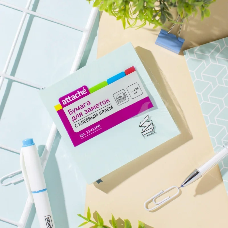 Стикеры Z-сложения Attache для диспенсеров подойдут в любые Z-диспенсеры . Цвет: голубой, в блоке 100 листов. Длина клейкой стороны 76 мм. Клеевая система с клейкостью — 18 Н/м . После удаления бумаги на поверхности не остается следов клеевого состава, лист можно крепить повторно. Бумага плотностью 62 г/кв.м. имеет особое покрытие, благодаря которому листочки легко отделяются от блока, меньше закручиваются, на них можно делать надписи любыми пишущими принадлежностями в любом месте. Формат 76×76 мм.