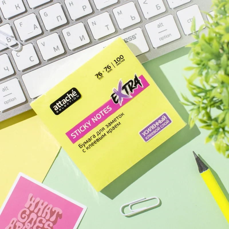 Стикеры Attache Selection Extra в формате 76×76 мм, желтого цвета, 100 листов. Идеально подойдут для сотрудников творческих профессий и руководителей: рекомендуются для использования в процессе совещаний, обучения, мозговых штурмов, а также просто на рабочем месте для создания напоминаний о важных делах. Тон стикеров — неоновый. Плотность бумаги: 75 г/кв.м. клейкий слой — 50 Н/м . Длина клейкой стороны 76 мм.