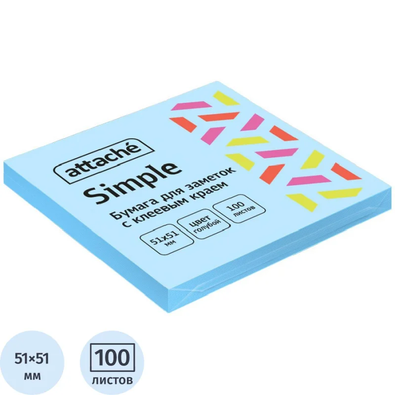 Стикеры Attache Simple 51х51 мм пастельные голубые (1 блок,100 листов) Стикеры Attache в формате 51x51 мм, голубого цвета, состоят из 100 листов. Хорошо подойдут для сотрудников творческих профессий и руководителей: рекомендуется для использования в процессе совещаний, обучения, мозговых штурмов. Тон стикеров - пастельный. Плотность бумаги составляет 60 г/кв.м, клейкий слой - 22 Н/м. После удаления бумаги на поверхности не остается следов клеевого состава, лист можно крепить повторно. Длина клейкой стороны 51 мм. Особых условий хранения не требует, сертификации не подлежит, срок годности не ограничен.Чтобы увеличить срок службы стикеров, пожалуйста, следуйте рекомендациям:1) Отделять стикер от блока следует вдоль клеевой полосы. Так можно избежать скручивания и последующего отклеивания стикера.2) Прежде чем наклеивать стикер, убедитесь в отсутствии грязи и пыли на поверхности. На чистой поверхности срок службы клеевого слоя более продолжителен.Товар относится к ценовому сегменту 'суперэконом'. Имеет упрощенные характеристики и более простую упаковку. Отвечает основным требованиям потребления.Законодательные и технические документы: