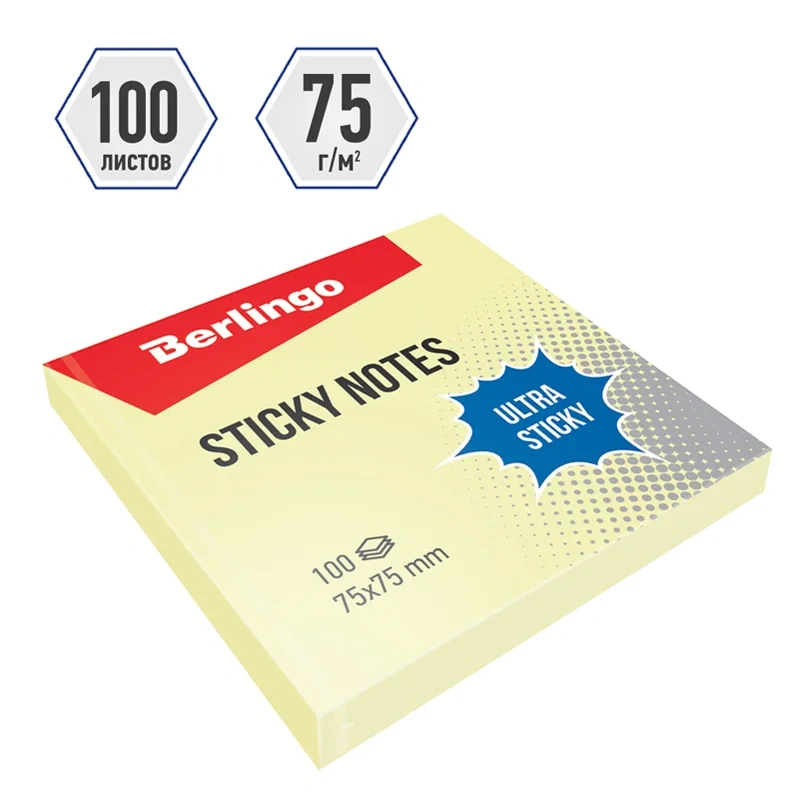Блок для записей с клейким краем Berlingo Ultra Sticky желтый, пастель, 75х75мм, 100 листов