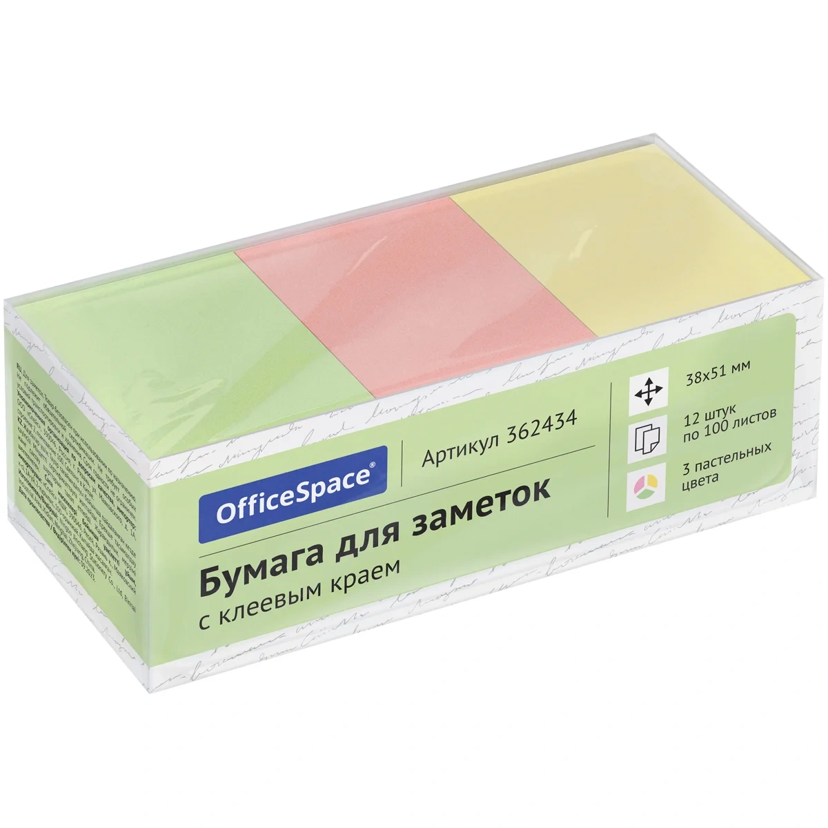 Самоклеящийся блок OfficeSpace, 38*51мм, 12 блоков по 100л., 3 пастельных цвета