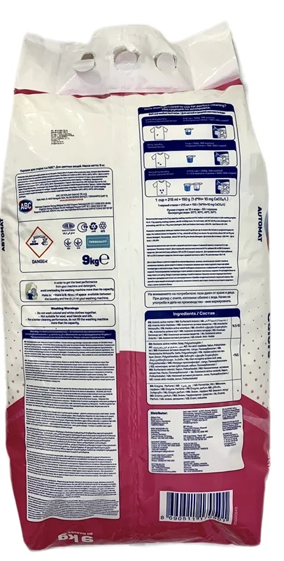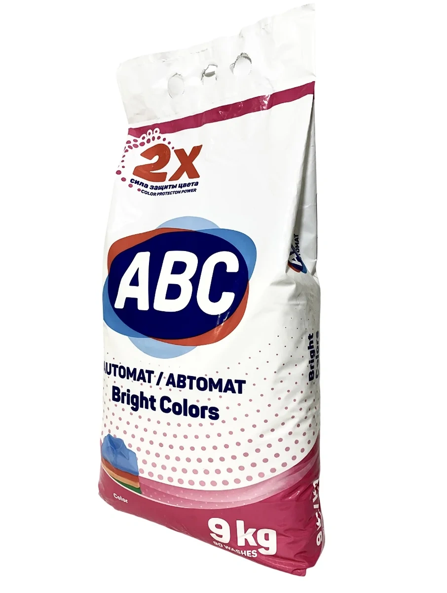 Порошок АВС для стирки цветного белья. Порошок для автоматической стирки цветного белья удаляет стойкие пятна, в комплексе с активными компонентами усиленного действия глубоко проникают в волокна ткани и эффективно справляются со всеми видами загрязнений. Благодаря системе контроля пенообразования, средство эффективно выполаскивается и не остается в волокнах ткани после стирки. Натуральные ферменты и компоненты удаляют 99,9% микробов , а также все виды бытовых клещей и продукты их жизнедеятельности из волокон ткани. Удаляет неприятные запахи. Типы тканей: хлопок, лен, полиэстер, вискоза, нейлон, акриловое волокно.