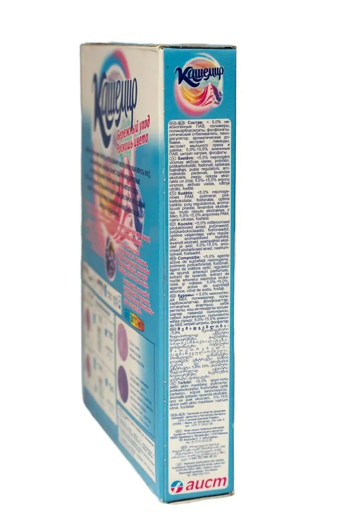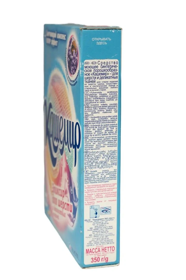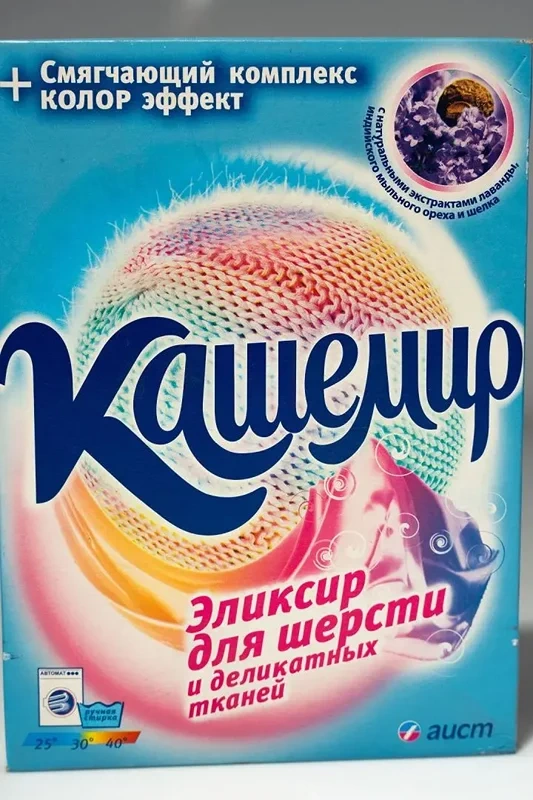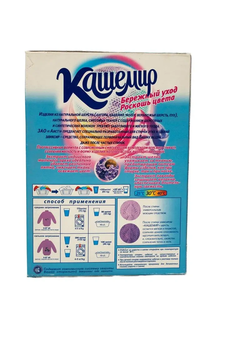 СМС Аист-Кашемир 350г для шерстяных тканей.Предназначен для стирки изделий из шерсти, шёлка, искусственных и синтетических тканей в стиральных машинах любого типа и ручной стирки при температуре 25С - 40С.Состав: менее 5% нПАВ, мыло, полимеры, поликарбоксилаты, фосфонаты, фосфаты, 5-15% а-ПАВ, цитрат натрия. Дополнительно: оптич.отбеливатель, пенорегулятор, ароматич.добавки, экстракт лаванды, мыльного ореха и шелка.4600905000974 Срок годности: 36 мес.