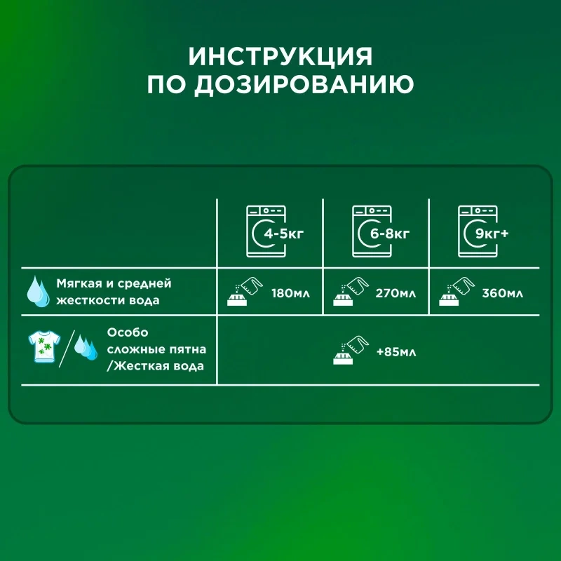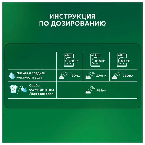 Способ применения: для достижения наилучших результатов используйте 150 г стирального порошка на 1 загрузку белья (до 5 кг).