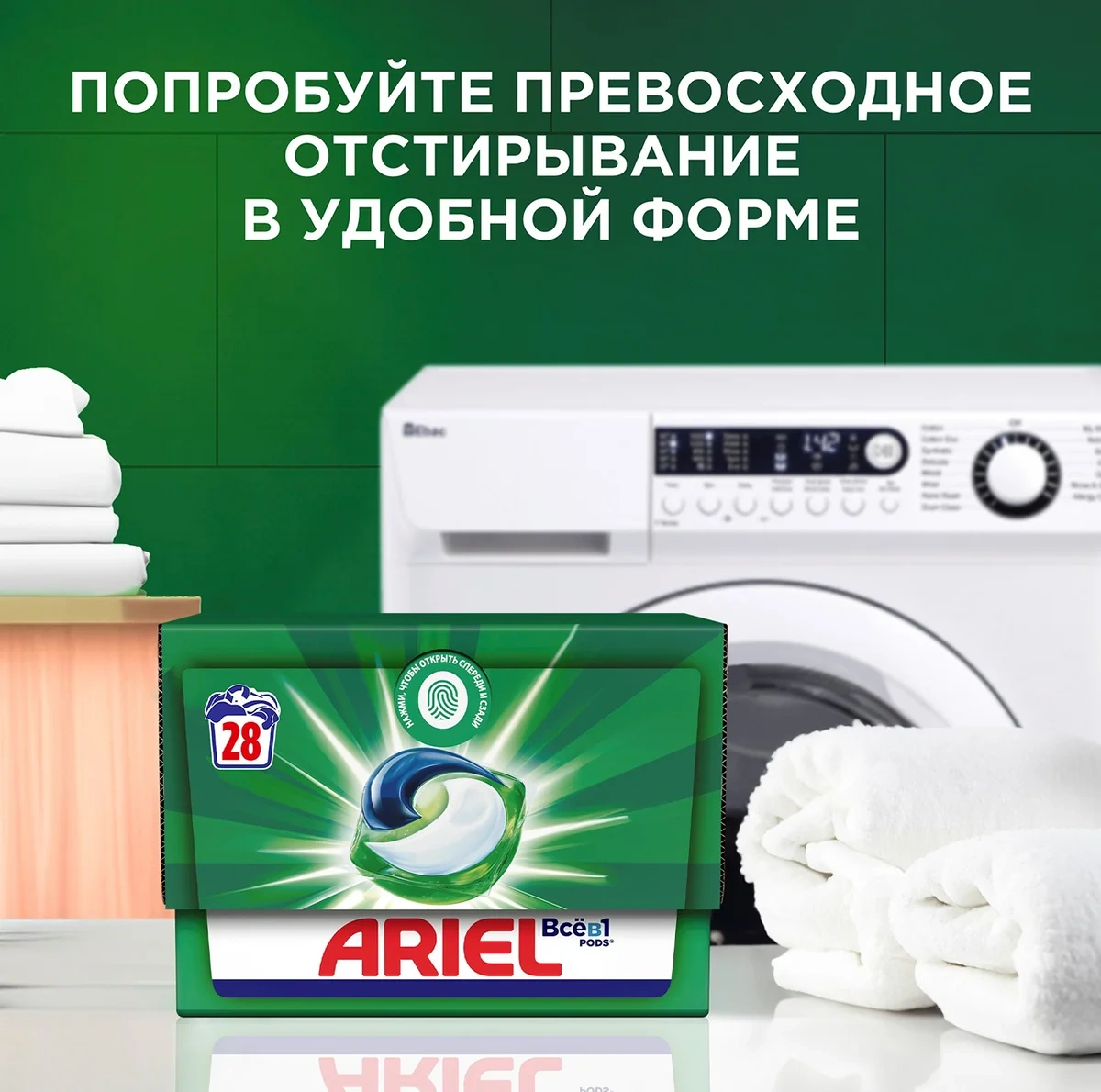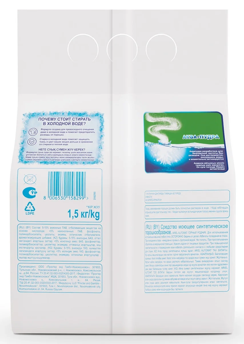 Рекомендуем также обратить внимание на большую упаковку стирального порошка Ariel Горный родник (12 кг), которая позволяет значительно сэкономить на стоимости одной стирки и дольше наслаждаться чистотой вещей.
