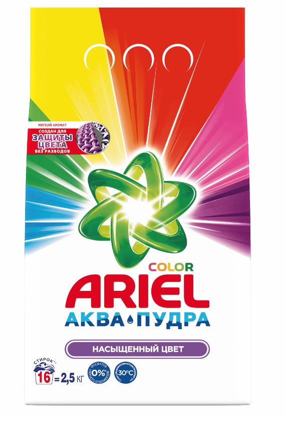 Превосходно и бережно отстирывает загрязнения на одежде даже в холодной воде, и дарит белью приятный аромат свежести. Безупречная чистота и приятный аромат одежды дарят прекрасное настроение и уверенность в себе, поэтому очень важно уделять должное внимание стирке. Именно для этого мы создали стиральный порошок Ариэль Аквапудра для цветного белья. Благодаря новой технологии, Ариель Аквапудра растворяется, едва коснувшись воды, и моментально активируется: удаляет трудновыводимые пятна, глубоко проникая в структуру волокон, и не дает загрязнениям въедаться. Порошок устраняет загрязнения, вызывающие неприятные запахи, такие как запах пота и тела, придавая одежде сияющую чистоту даже на воротничках и манжетах рубашек, и не оставляя следов и разводов