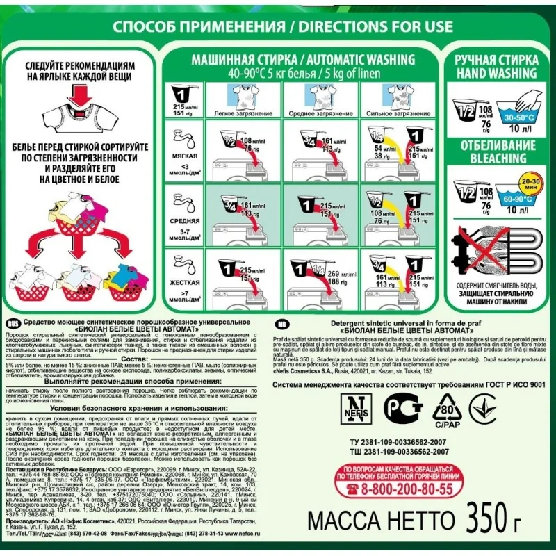 Стиральный порошок Биолан Белые цветы 350г, автомат