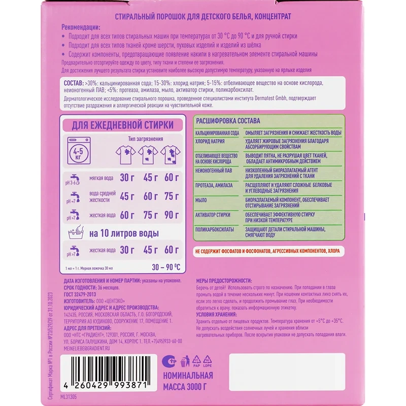 5% или более, но менее 15%: анионные ПАВ; менее 5%: неионогенные ПАВ, мыло (соли жирных кислот), отбеливающие вещества на основе кислорода, энзимы, оптический отбеливатель, поликарбоксилаты, фосфонаты, ароматизирующий компонент (в т. ч. гексилциннамаль).