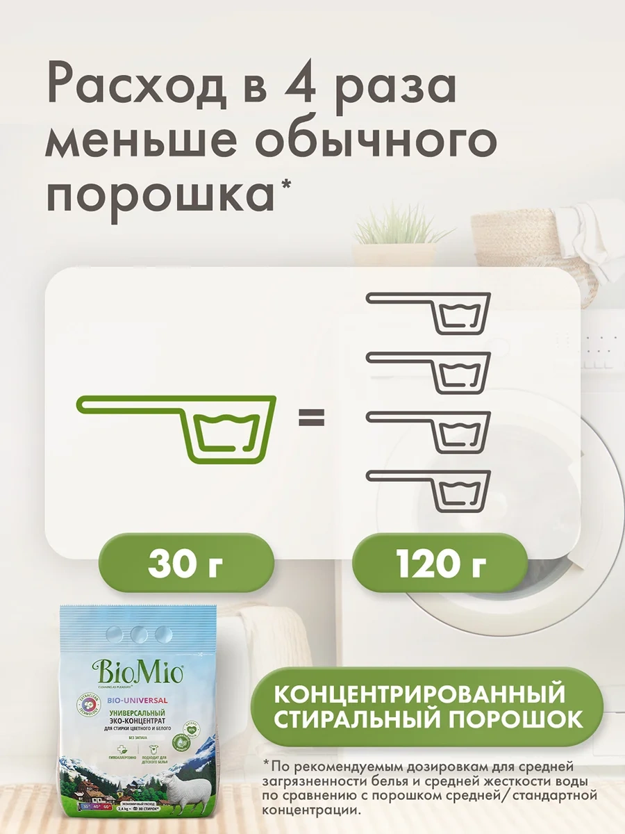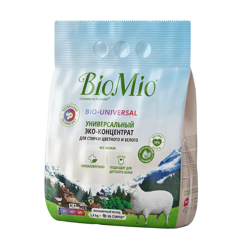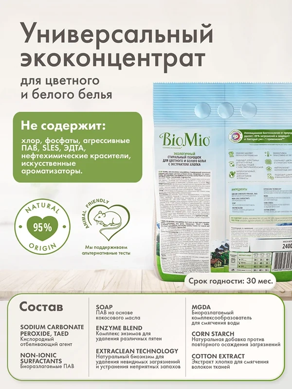 Универсальный экологичный стиральный порошок концентрат Colors&Whites BioMio для стирки цветного и белого белья глубоко удаляет пятна и загрязнения даже при стирке от 30С. Благодаря инновационной биотехнологии EXTRACLEAN TECHNOLOGY удаляет невидимые загрязнения и устраняет неприятные запахи, защищает от бактерий с 1 применения. Экстракт хлопка в составе способствует сохранению цвета и смягчению волокон тканей. Хорошо вымывается из волокон при полоскании, поэтому идеально подходит для стирки детского белья и одежды людей с чувствительной кожей. Экономично расходуется благодаря концентрированной формуле. Биоразлагаем, безопасен для септиков и планеты. Не содержит фосфаты, агрессивные ПАВ, SLES, хлор, ПЭГ, ЭДТА, отдушки и оптические отбеливатели.