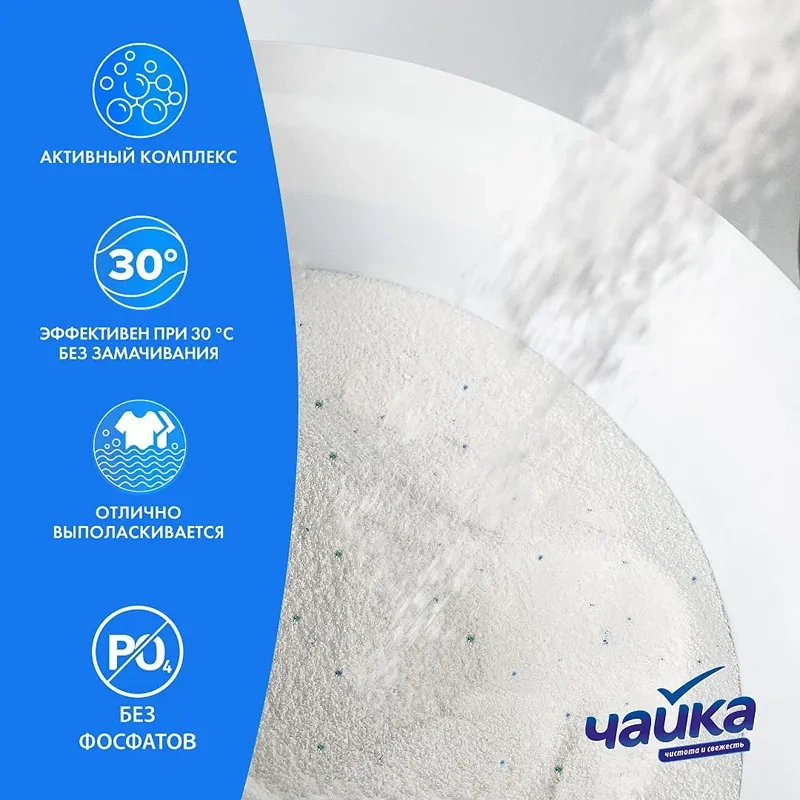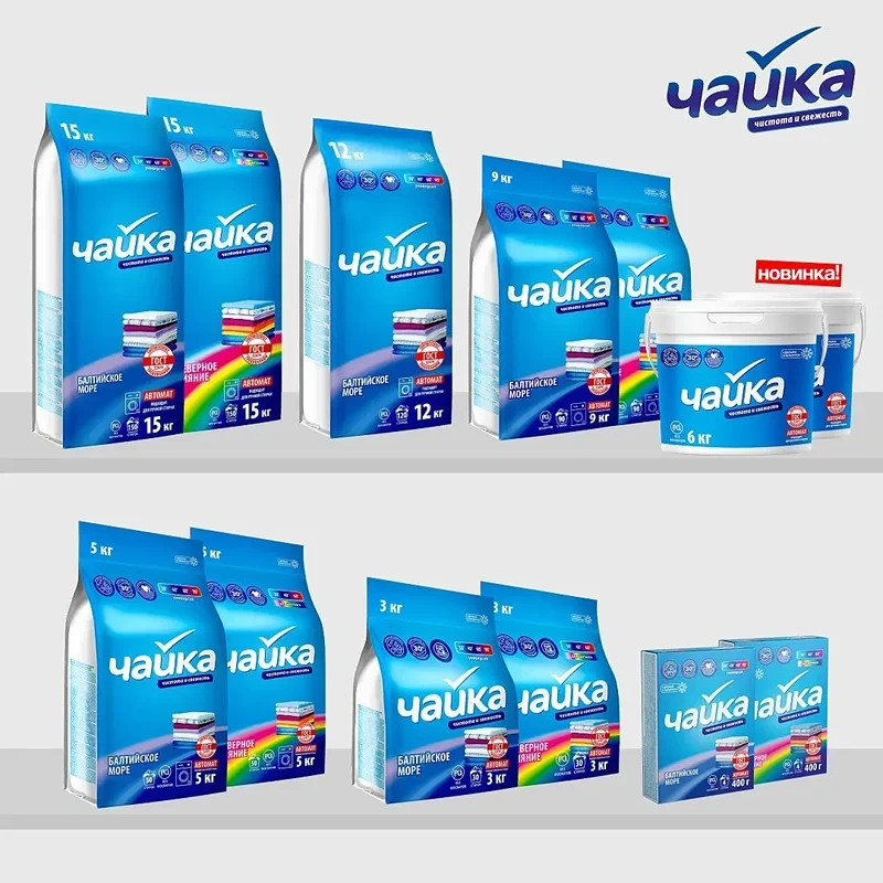 Порошок стиральный Чайка-автомат 6кг Балтийское море в ведреНазначение: синтетическое моющее средство Чайка порошкообразное для использования в стиральных машинах любого типа. Рекомендованная температура стирки указана на ярлыках текстильных изделий. Подходит для стирки всех типов белья, кроме изделий из шерсти и шелка.Способ применения: Насыпьте необходимое количество порошка в соответствующее отделение стиральной машины перед началом стирки. Подробная информация о дозировке указана на упаковке.Средний расход 100 г порошка на 4-5 кг белья.Меры предосторожности: Беречь от детей. Избегать попадания в глаза. При попадании в глаза -немедленно промыть проточной водой.. При повышенной чувствительности и повреждениях кожи избегать длительного контакта с любыми средствами для стирки.Состав порошка: 5-15% анионные ПАВ; <5% поликарбоксилаты ,неионогенные ПАВ, фосфонаты, энзимы, отдушка.Условия хранения: хранить в недоступном для детей месте.Срок годности: 2 года