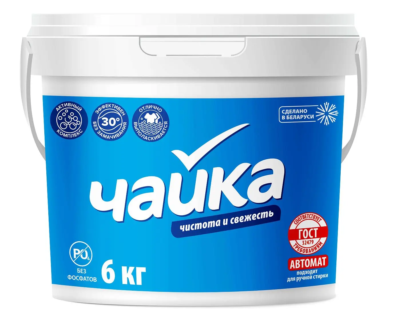 Порошок стиральный Чайка-автомат 6кг Северное сияние для цветного в ведреНазначение: синтетическое моющее средство Чайка порошкообразное для использования в стиральных машинах любого типа. Рекомендованная температура стирки указана на ярлыках текстильных изделий. Подходит для стирки всех типов белья, кроме изделий из шерсти и шелка.Способ применения: Насыпьте необходимое количество порошка в соответствующее отделение стиральной машины перед началом стирки. Подробная информация о дозировке указана на упаковке.Средний расход 100 г порошка на 4-5 кг белья.Меры предосторожности: Беречь от детей. Избегать попадания в глаза. При попадании в глаза -немедленно промыть проточной водой.. При повышенной чувствительности и повреждениях кожи избегать длительного контакта с любыми средствами для стирки.Состав порошка: 5-15% анионные ПАВ; <5% поликарбоксилаты ,неионогенные ПАВ, фосфонаты, энзимы, отдушка.Условия хранения: хранить в недоступном для детей месте.Срок годности: 2 года