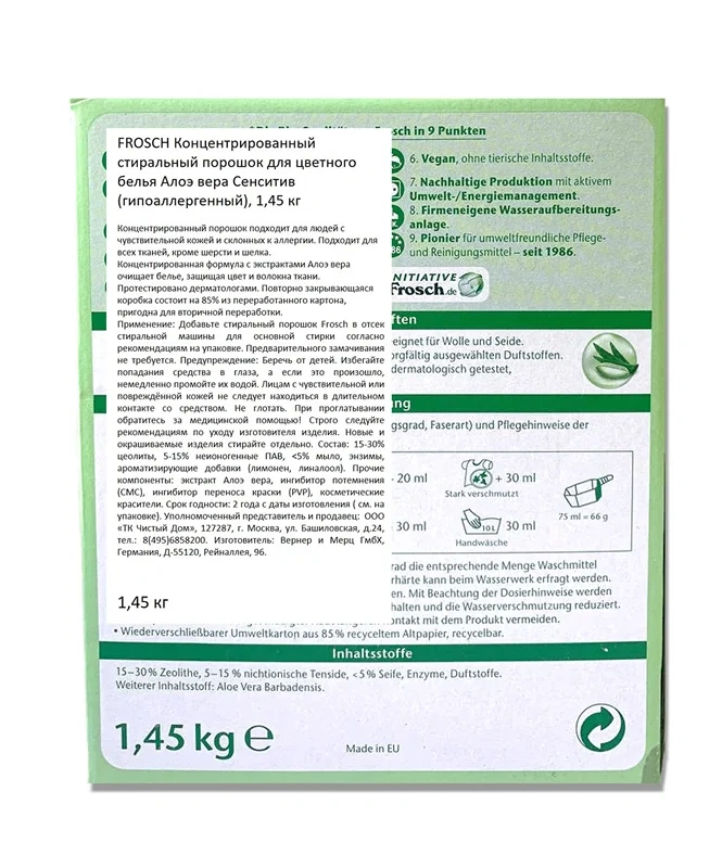 Стиральный порошок Frosch Алоэ вера для цветного белья, 1.45кг