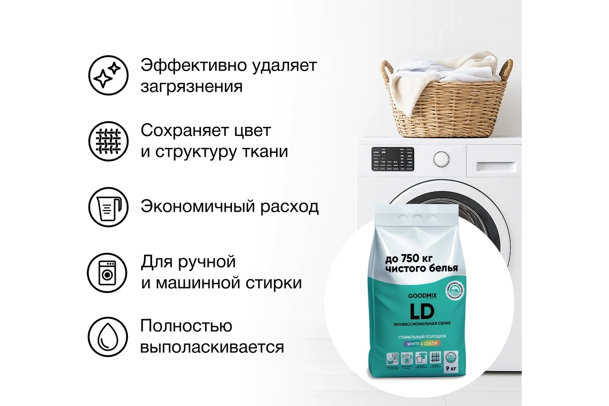 GOODMIX LD представляет собой высококонцентрированный стиральный порошок в экономичной упаковке по 9 кг, разработанный специально для профессионального использования. Средство эффективно работает в температурном диапазоне от 30 до 90 градусов, обеспечивая безупречную чистку различных типов тканей, включая хлопок, лен, синтетические и смесовые материалы. Порошок полностью совместим с другими продуктами линейки GOODMIX, что позволяет создавать оптимальные программы стирки для любых задач.