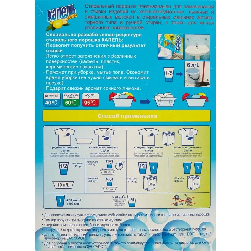 Назначение: предназначено для замачивания и стирки изделий из хлопчатобумажных, льняных, синтетических и смесовых тканей в стиральных машинах активаторного типа и руч-ной стирки, а так же мытья различных поверхностей.