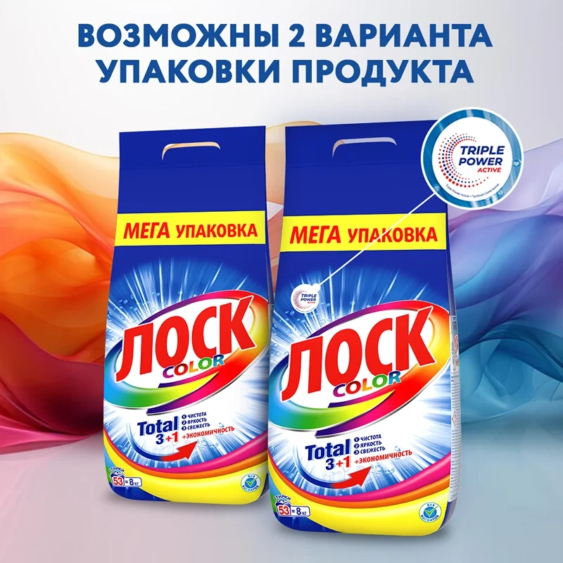 Порошок для стирки Лоск Колор: справляется с различными пятнами; сохраняет яркость цветного белья; дарит вещам приятный аромат; работает в стиральных машинах любого типа и в воде любой жесткости; эффективен уже при 30C; не содержит фосфатов и хлорных соединений, безопасен для окружающей среды и кожи человека; 100 % перерабатываемая упаковка.