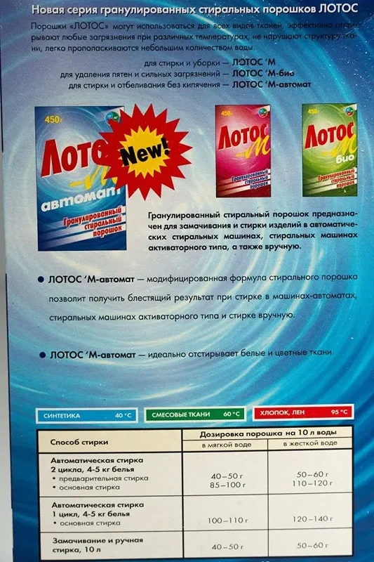 Стиральный порошок Лотос Автомат 450 г предназначен для замачивания и стирки изделий из хлопчатобумажных, льняных, синтетических и смешанных волокон в стиральных машинах любого типа, а также для влажной уборки помещений и мытья загрязненных окрашенных поверхностей, кафеля, пластика. 'Лотос-М', Автомат 450 г - это мелкозернистый белый порошок, который является синтетическим моющим средством и очень легко растворяется в воде.Состав:АПАВ-5-15%,НПАВ-менее 5%,фосфаты-15-30%,кислородсодержащий отбеливатель -менее 5%,вещевства антикоррозионной защиты, регулятор рН, полимеры, сульфаты, пеногаситель.