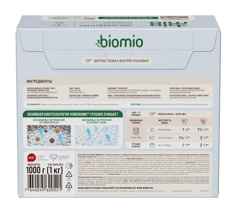 Менее 5%: неионогенные ПАВ, пеногаситель, поликарбоксилаты, энзимы, КМЦ, ЭДТА, мыло, отдушка; 5-15%: фосфаты, силикаты, анионные ПАВ.
