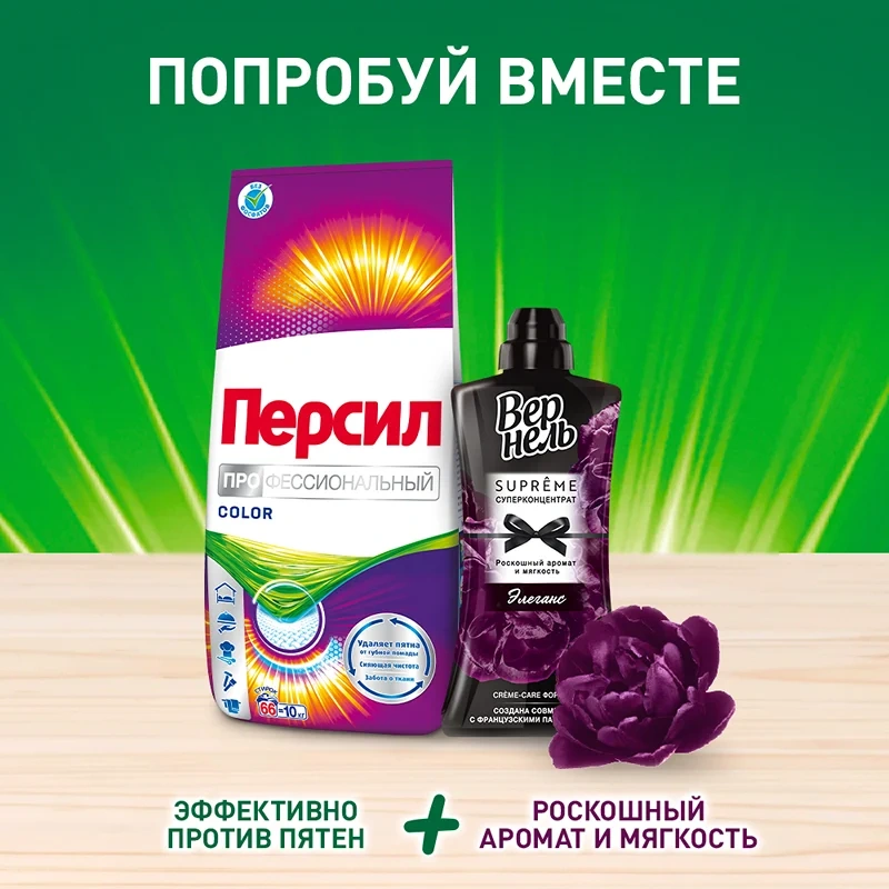 Порошок для стирки Персил Профессиональный: эффективно удаляет пятна с цветного белья, включая следы от шоколада, фруктов и губной помады; заботится о ткани и сохраняет яркость вещей; обеспечивает свежесть надолго; подходит для стирки цветных изделий из хлопчатобумажных, льняных, синтетических тканей и тканей из смешанных волокон в стиральных машинах-автоматах и ручной стирки в воде любой жесткости; обеспечивает защиту от образования известкового налета для жесткой и мягкой воды; не содержит фосфатов и хлорного отбеливателя; 100 % перерабатываемая упаковка.