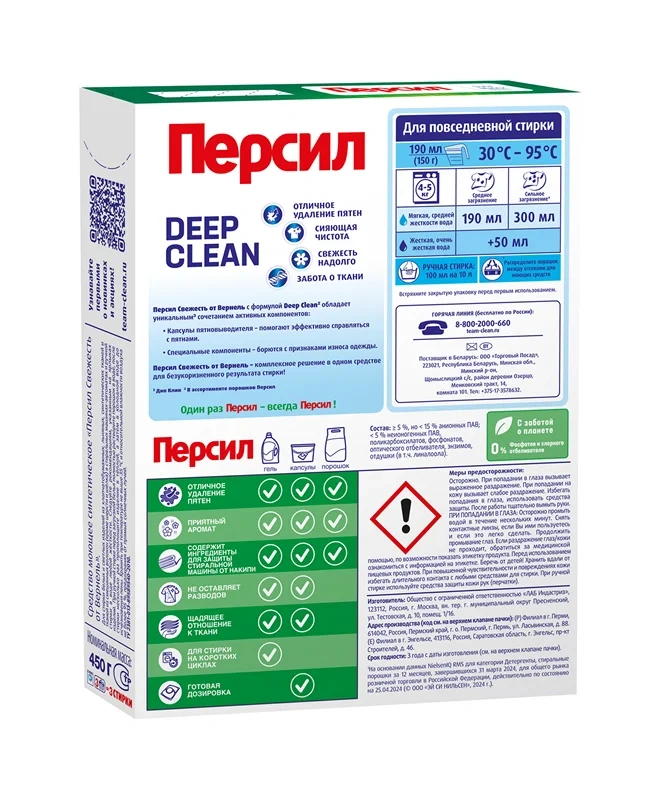 Порошок для стирки Персил Свежесть от Вернель: тщательно отстирывает белые вещи и удаляет самые различные пятна; возвращает вещам первозданную белизну; дарит белью приятный аромат и длительную свежесть от Вернель; подходит для стирки белых и светлых изделий из хлопчатобумажных, льняных, синтетических тканей и тканей из смешанных волокон в стиральных машинах-автоматах и ручной стирки в воде любой жесткости; обеспечивает защиту от образования известкового налета для жесткой и мягкой воды; не содержит фосфатов и хлорного отбеливателя; 100 % перерабатываемая упаковка.
