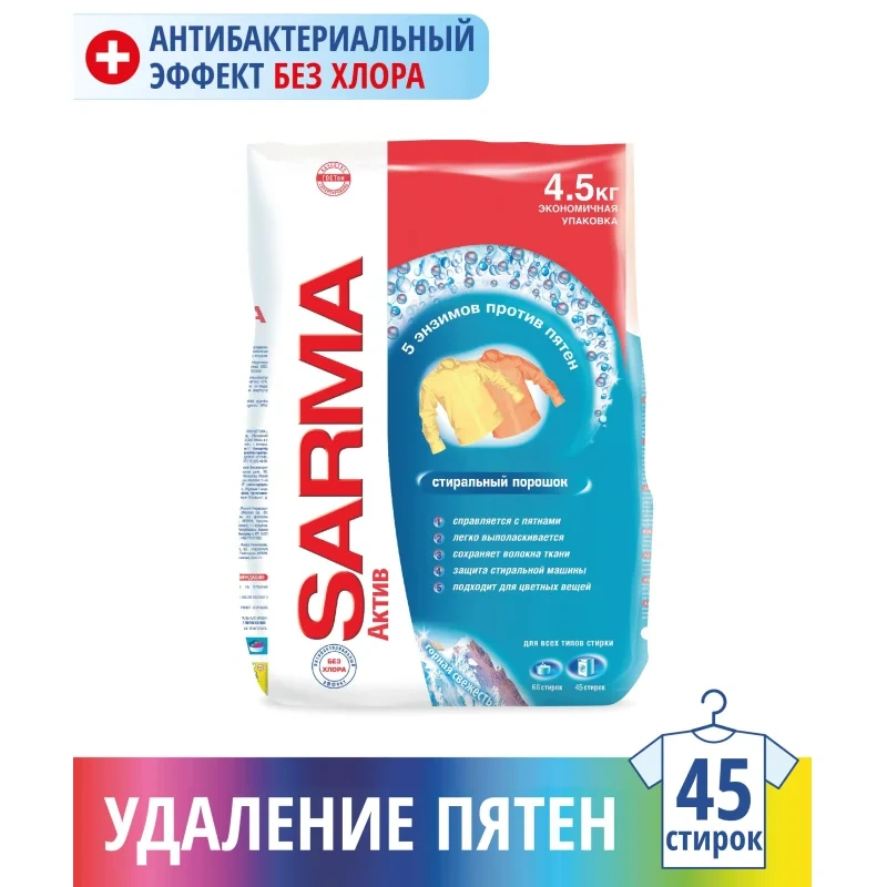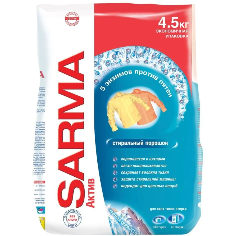 Порошок стиральный универсальный Sarma Актив горная свежесть 4.5 кг. Назначение: предназначен для стирки белого и цветного белья из хлопчатобумажных, льняных, синтетических тканей, а также вещей из смешанных волокон в стиральных машинах любого типа и вручную. Важно! Не подходит для стирки изделий из натурального шелка и шерсти. Способ применения: замачивание (на 10 л воды) - 80 мл в мягкой воде и воде средней жесткости 100 мл в жесткой воде - при температуре 30-60 С; Ручная стирка (на 10 л воды) - 100 мл в мягкой воде и воде средней жесткости 125 мл в жесткой воде - при температуре до 30-60 С; Стирка в автоматических стиральных машинах (на 4-5 кг белья) - 180 мл в мягкой воде и воде средней жесткости 225 мл в жесткой воде - при температуре 30-95 С. Меры предосторожности: ОСТОРОЖНО. При попадании в глаза вызывает выраженное раздражение. Промыть водой и обратиться к врачу. БЕРЕЧЬ ОТ ДЕТЕЙ. При повышенной чувствительности и повреждениях кожи использовать резиновые перчатки. После полного использования средства упаковку утилизировать как бытовой мусор. Состав: 5-15%: фосфаты, кислородсодержащий отбеливатель, анионные ПАВ; <5%: фосфонаты, пеногаситель, неионогенные ПАВ, поликарбоксилаты; энзимы, оптические отбеливатели, отдушка. Условия хранения: не выше 35 С. Срок годности: 36 месяцев с даты изготовления. Законодательные и технические документы: