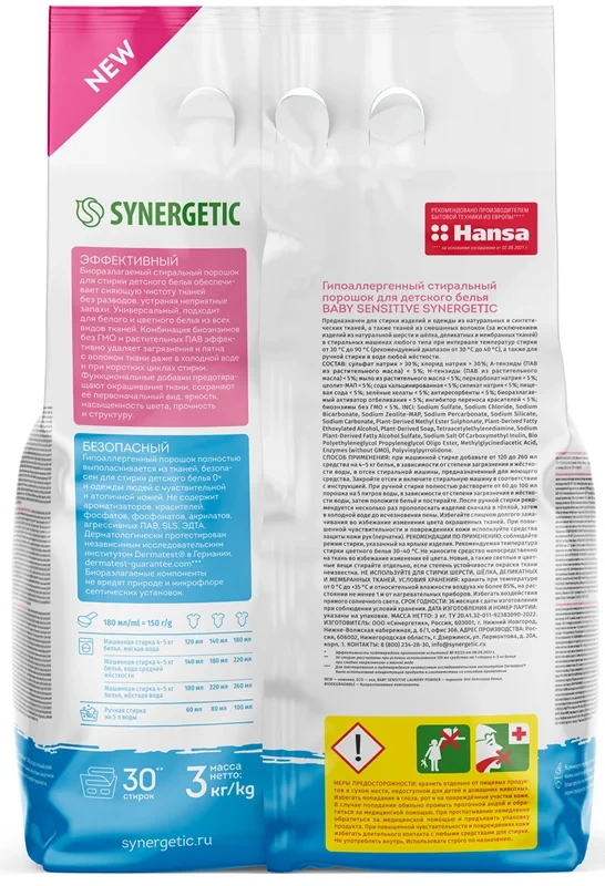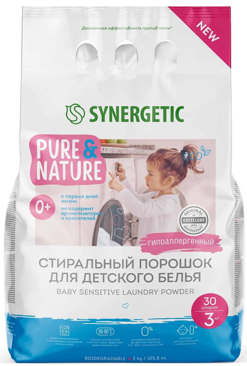 Стиральный порошок Synergetic Sensitive для детского белья, 3кг