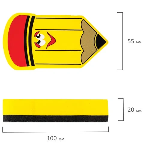 Встроенный магнит позволяет расположить стиратель в любом месте рабочей поверхности доски. Стиратель имеет эргономичную форму и необычный яркий дизайн. Размер - 55х100 мм. Стирающий слой выполнен из фетра. Поставляется в упаковке с европодвесом. Внимание: стирать надписи с доски рекомендуется лёгкими круговыми движениями.