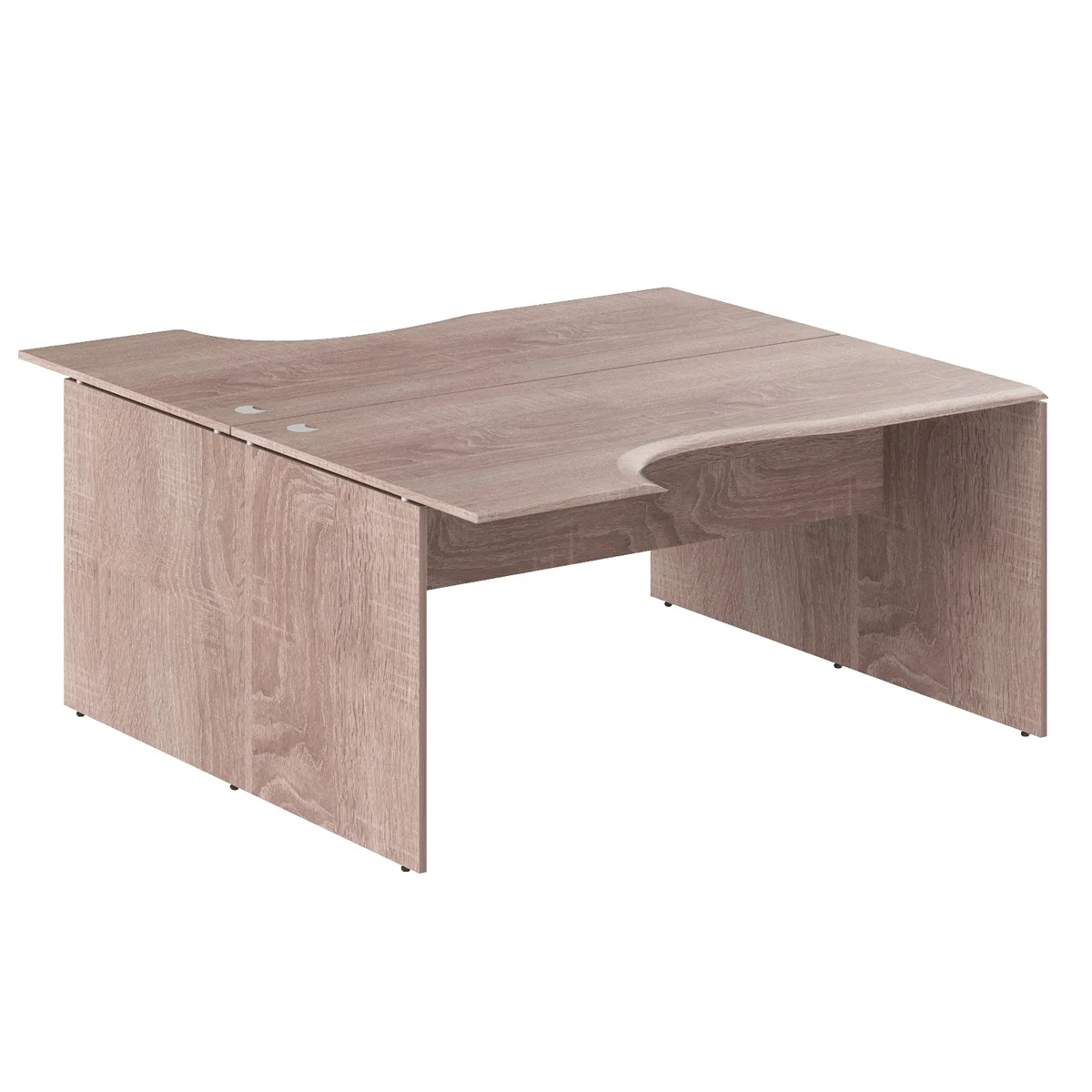 Большая рабочая станция на 2 рабочих места WAVE для офисного или домашнего использования, размер – 1600х1800х750 мм, цвет – Дуб Сонома. Оснащена надежными и долговечными опорами из ЛДСП 18мм, которые расположены по краям стола. Между столешницей и опорами установлены специальные проставки, что создает эффект «парящей столешницы». Солидная и прочная столешница из МДФ 19 мм эргономичной формы, в которой установлены 2 кабель-канала с декоративными заглушками. Столешницы можно разделить с помощью перегородки, что позволит создать изолированные рабочие места. Фрезерованные края столешниц гарантируют отсутствие острых углов, благодаря чему работать за ними комфортно, а плавные линии придают дизайну «объемный» вид. Надежная защита торцов всех элементов из ЛДСП - кромка ПВХ. Конструкция стола оснащена прочными силовыми креплениями – эксцентриковыми стяжками. Регулируемые по высоте опоры обеспечат столу устойчивость на неровном полу.