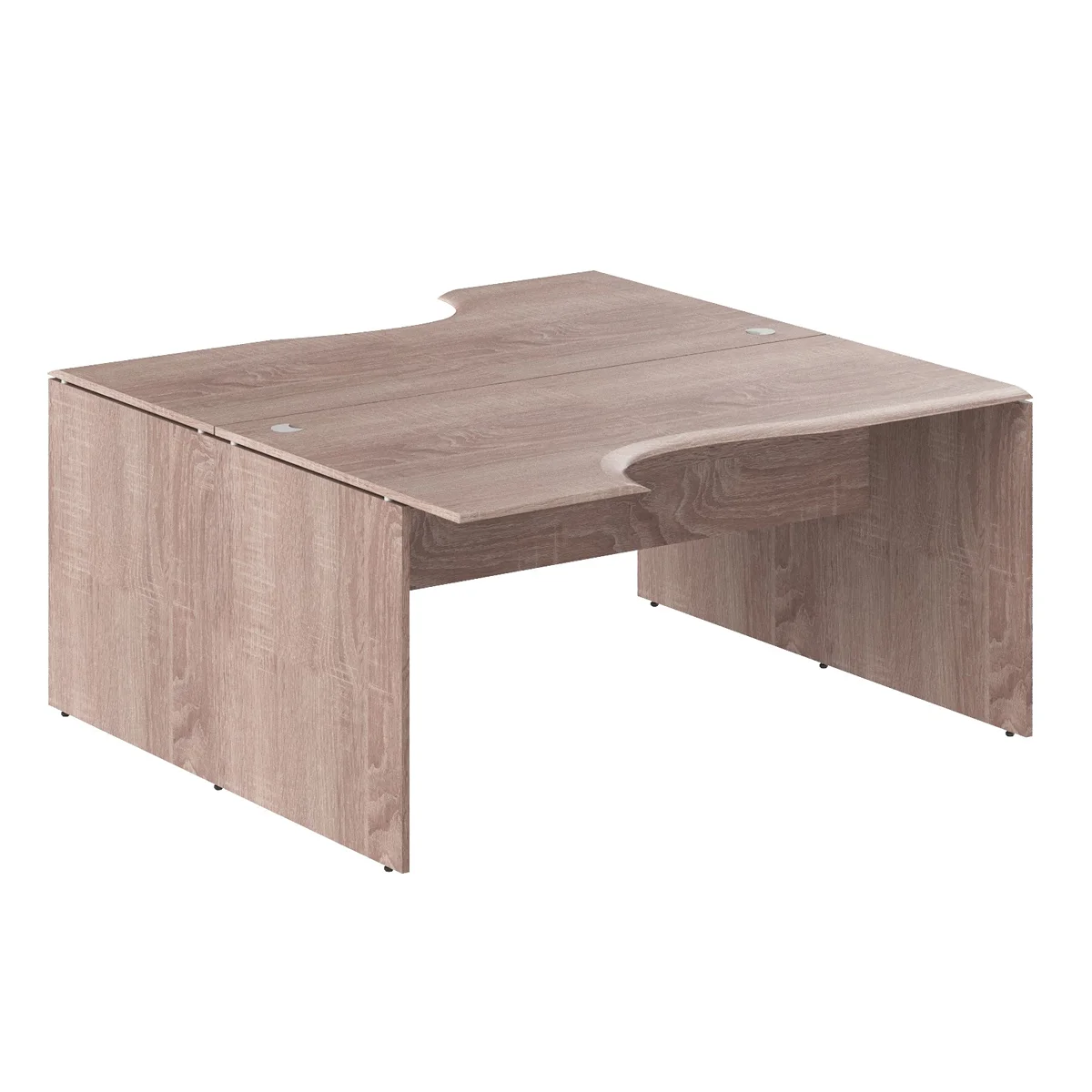 Большая рабочая станция на 2 рабочих места WAVE для офисного или домашнего использования, размер – 1600х1800х750 мм, цвет – Дуб Сонома. Оснащена надежными и долговечными опорами из ЛДСП 18мм, которые расположены по краям стола. Между столешницей и опорами установлены специальные проставки, что создает эффект «парящей столешницы». Солидная и прочная столешница из МДФ 19 мм эргономичной формы, в которой установлены 2 кабель-канала с декоративными заглушками. Столешницы можно разделить с помощью перегородки, что позволит создать изолированные рабочие места.Фрезерованные края столешниц гарантируют отсутствие острых углов, благодаря чему работать за ними комфортно, а плавные линии придают дизайну «объемный» вид. Надежная защита торцов всех элементов из ЛДСП - кромка ПВХ. Конструкция стола оснащена прочными силовыми креплениями – эксцентриковыми стяжками. Регулируемые по высоте опоры обеспечат столу устойчивость на неровном полу.
