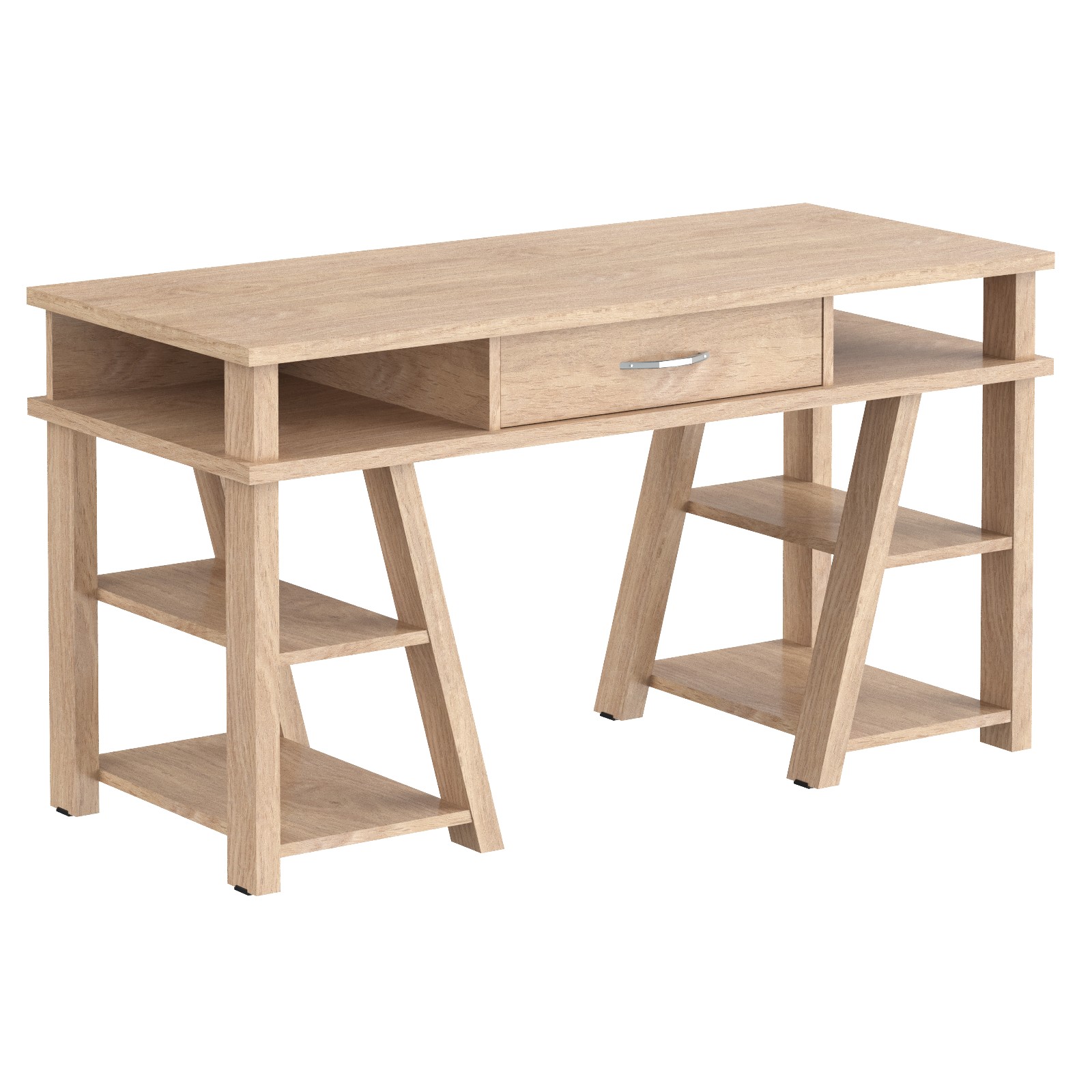 Очень, очень оригинальный компьютерный стол. Ни на что не похожий, свежий, запоминающийся - и при этом комфортный и полностью функциональный. Идеально подойдет для современных интерьеров. Оснащен выдвижным ящиком и двумя открытыми нишами под столешницей, а также полностью открытыми полками в качестве опор. Изготавливается в цветах: Венге Магия, Дуб Девон, Бургунди, Орех Даллас.