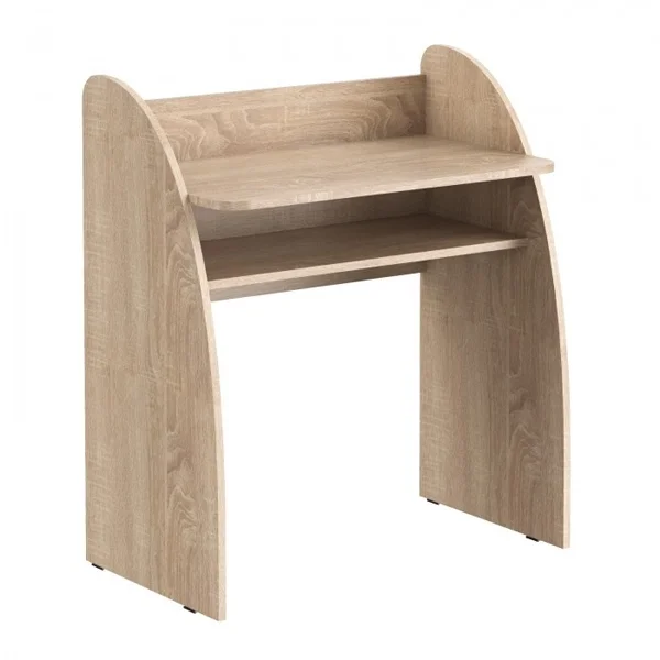 Компактный компьютерный стол оригинальной, элегантной формы. Максимально безопасный - за счет отсутствия острых углов. Имеет специальную полку под столешницей для хранения бумаг или клавиатуры. Изготавливается в цветах: Дуб Сонома светлый, Легно темный.