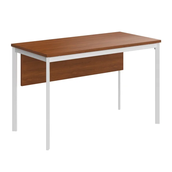 Универсальный рабочий стол IMAGO-S для офисного или домашнего использования, размер - 1200х600х755 мм, цвет – Орех Французский, цвет опор – Белый. Оснащен устойчивым и долговечным П-образным металлокаркасом типа «Бенч». Стол комплектуется декоративной фронтальной панелью (царгой). Солидная и прочная столешница 22 мм, надежная защита торцов всех элементов - кромка ПВХ 2 мм, регулировка по высоте для неровных полов.