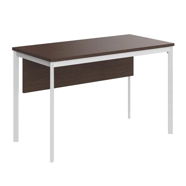 Универсальный рабочий стол IMAGO-S для офисного или домашнего использования, размер - 1200х600х755 мм, цвет – Венге Магия, цвет опор – Белый. Оснащен устойчивым и долговечным П-образным металлокаркасом типа «Бенч». Стол комплектуется декоративной фронтальной панелью (царгой). Солидная и прочная столешница 22 мм, надежная защита торцов всех элементов - кромка ПВХ 2 мм, регулировка по высоте для неровных полов.