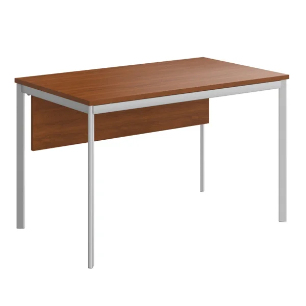 Универсальный рабочий стол IMAGO-S для офисного или домашнего использования, размер - 1200х720х755 мм, цвет – Орех Французский, цвет опор – Алюминий Матовый. Оснащен устойчивым и долговечным П-образным металлокаркасом типа «Бенч». Стол комплектуется декоративной фронтальной панелью (царгой). Солидная и прочная столешница 22 мм, надежная защита торцов всех элементов - кромка ПВХ 2 мм, регулировка по высоте для неровных полов.