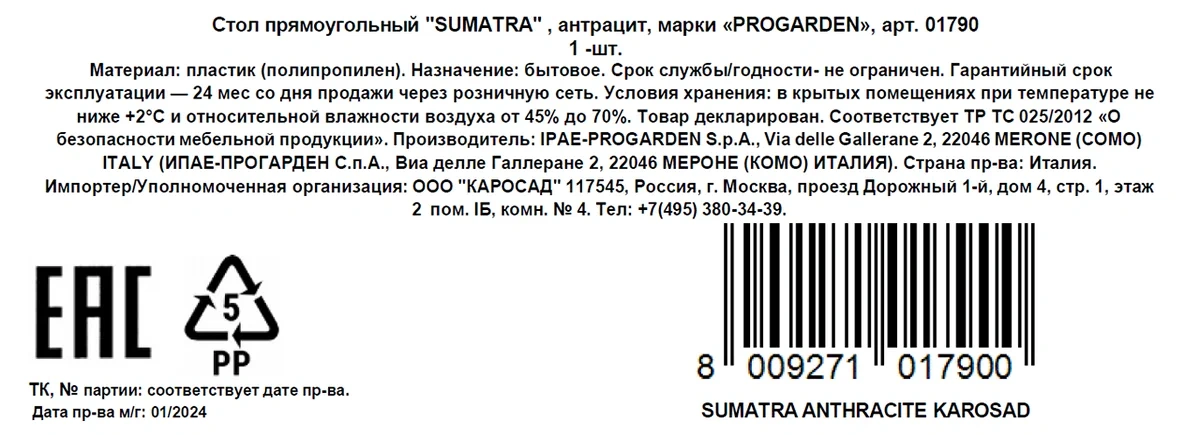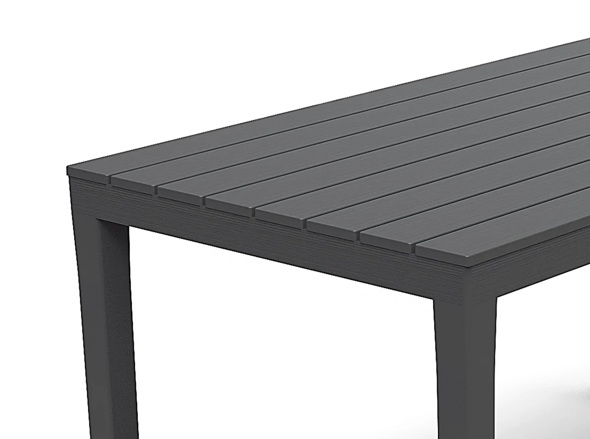 Прямоугольный стол Sumatra имеет размер 138x78x72 см. Выполнен из пластика с имитацией структуры дерева. Цвет стола - антрацит. Изготовлен из ударопрочного полипропилена, стойкого к воздействию окружающей среды. Стол разбирается, что очень удобно для хранения и транспортировки. Стол позволяет с комфортом разместиться нескольким людям на открытой площадке. Материал: пластик. Максимальная нагрузка 65 кг. Упаковка термоусадочная пленка.