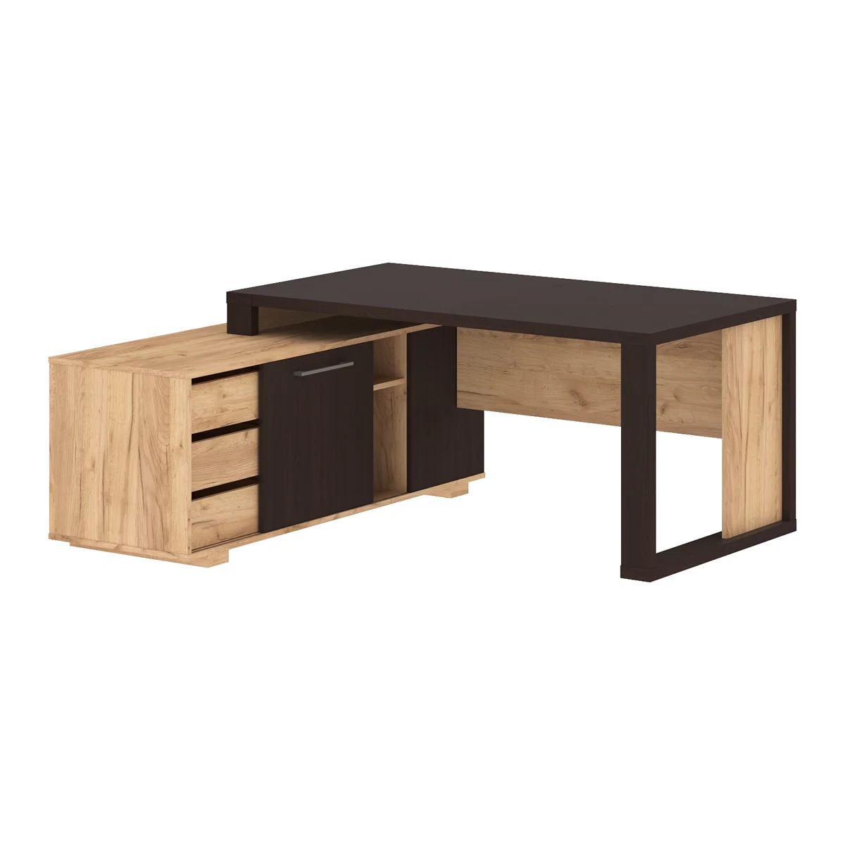 Большой рабочий стол для руководителя ALTO для офисного или домашнего использования, размер – 1750х1600х750 мм, тип – левосторонний, основной цвет - Венге Магия, дополнительный цвет - Дуб Девон. Стол оснащен солидной толщины столешницей из ЛДСП 38 мм. Опоры стола выполнены в оригинальном дизайне в виде широкой рамы с контрастной декоративной вставкой. Сбоку стола размещена тумба с 3 ящиками и открытой секцией, оснащенная слайд-дверью. Все торцы основных элементов надежно защищены кромкой ПВХ – 2 мм. Конструкция стола оснащена прочными силовыми креплениями – эксцентриковыми стяжками. Регулируемые по высоте опоры обеспечат столу устойчивость на неровном полу.